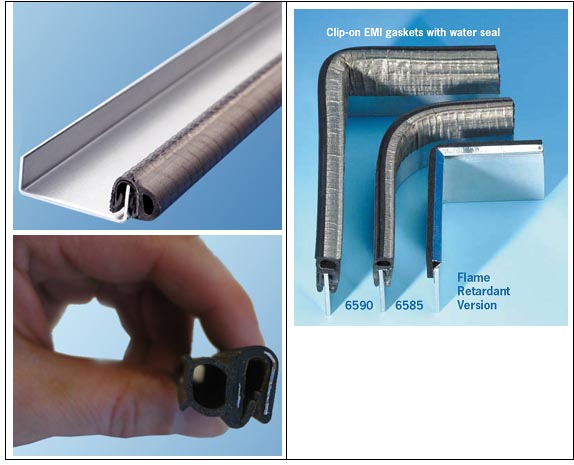This range of easily mounted clip-on gaskets is composed of a separate sponge rubber water seal and an EMI-shielding side of highly conductive, wear-resistant metallized fabric. The construction is very flexible thanks to the hollow rubber, so a low closure force is guaranteed.