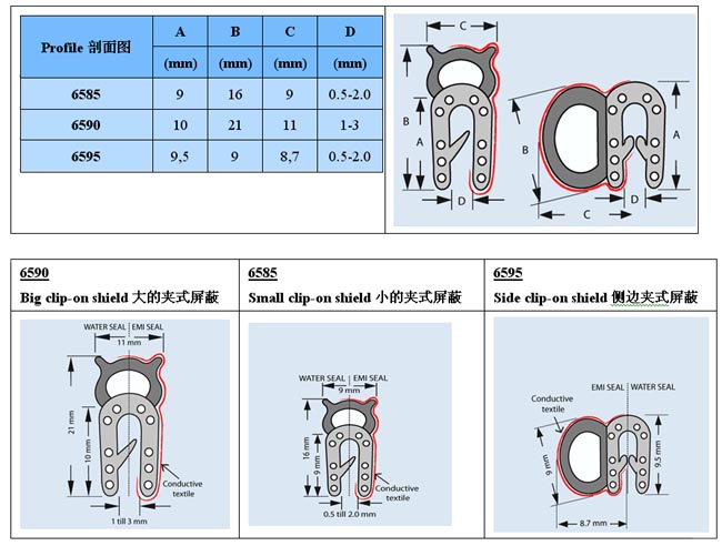 這個(gè)系列的容易裝配的夾式墊圈由一個(gè)分開(kāi)的海綿狀橡皮水封和一個(gè)EMI屏蔽側(cè)邊的高度導(dǎo)電的,抗磨損的用金屬處理的織物組成。結(jié)構(gòu)是非常軟的由于是空的橡膠,因此確保了一個(gè)低的閉合力。